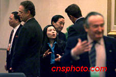 2月23日上午,國際奧委會評估團在北京飯店第三次聽取北京奧申委的陳述報告。報告會前,中國著名乒乓球運動員鄧亞萍與國際奧委會評估團成員親切交談。作者:趙彤杰