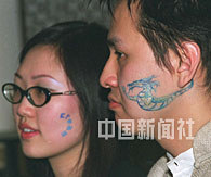 臉上繪有各種圖案的年輕人日前參加北京一間家具店的開業派對,“體繪”如今已成為年輕人的一種時髦。中新社圖 史利 攝