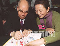 全國政協委員、著名京劇表演藝術家袁世海,在北京參會中為青年委員李羚題寫折扇。中新社記者 錢興強 攝
