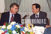 中新網紐約3月20日消息(記者 陳建)正在美國進行訪問的國務院副總理錢其琛,今天早晨在紐約與當地主流媒體負責人共進早餐。圖為錢副總理正與美國在線—時代華納首席執行官萊文親切交談。
