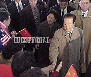 中國國務(wù)院副總理錢其琛三月二十一日乘機從紐約抵達華盛頓里根國家機場,受到近百名華盛頓華人華僑和留學(xué)生代表和中國駐美使館高級官員的熱烈歡迎.中新社圖 京華 攝