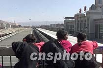 來(lái)自拉薩的藏族婦女在西寧火車站天橋上觀看即將出發(fā)的列車,盼望抵達(dá)拉薩的青藏鐵路早日建成。青海省西寧火車站是未來(lái)青藏鐵路的起點(diǎn)。中新社記者 毛建軍 攝