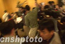 云集海口的一百多名中外記者,十一日晚七時許采訪海南省政府外事辦公室在海口文華大酒店舉行的新聞發布會后,立刻爆發新聞大戰,眾記者奮力爭奪中國外長唐家璇接受美國政府致歉信的文稿,然后各自飛奔去發稿。中新社記者 賈國榮 攝