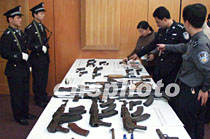 廣東省嚴打整治斗爭戰果顯著,四月以來,全省共破各類刑事案件五千八百起,抓獲犯罪嫌疑人六千多名,繳獲槍枝一百多支。圖為警方展示近日繳獲的槍械。中新社圖 梁永強 攝