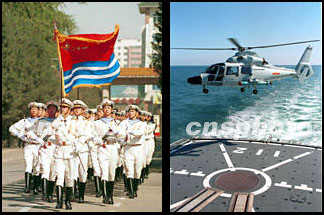 左為海軍儀仗隊(duì),右為艦載直升機(jī)攜帶反潛魚雷起飛攻擊演練