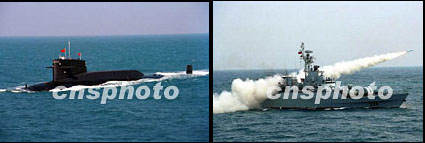 左為中國(guó)戰(zhàn)略核潛艇,右為導(dǎo)彈驅(qū)逐艦發(fā)射反艦導(dǎo)彈