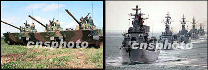 左為海軍陸戰(zhàn)隊(duì)兩棲坦克,右為導(dǎo)彈驅(qū)逐艦和導(dǎo)彈護(hù)衛(wèi)艦組成的特混編隊(duì)