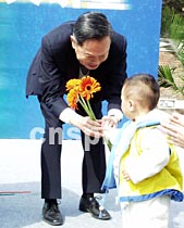 著名物理學家楊振寧先生,二十六日在北京清華大學理學院作《美與物理學》的報告前,接受一位北京小朋友獻出的鮮花。中新社記者 張勤 攝
