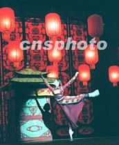 由張藝謀執導、中國芭蕾舞團演出的舞劇《大紅燈籠高高掛》二十六日晚在新落成的北京天橋劇場首次向新聞媒體亮相。圖為劇中三姨太由朱研扮演。中新社圖 史利 攝