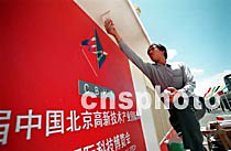 五月八日,第四屆《國際周》暨北京國際科技博覽會的各項籌備工作已就緒,工人們在刷最后一遍油漆。中新社圖 史利 攝