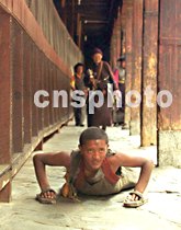 在今夏西藏的大昭寺寺廟里,這些五體投地拜奉佛祖的藏民,要向?yàn)槠渑恼盏挠慰褪杖《馁M(fèi)用。在西藏的一些寺廟里這便成了一種香火生意。中新社記者 宋吉河 攝