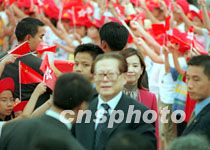 國家主席江澤民9日結(jié)束訪問香港,一百五十名學(xué)生在機場歡送。 中新社傳真 盧峰 攝