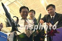 中國航空博物館五月在北京國際科技博覽會上展示國產新型戰機模型,一名臺灣商人頗感興趣地商洽訂貨,其中包括海南中美撞機事件里的殲八型戰機模型。中新社記者 賈國榮 攝