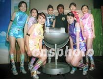 歌星李彩樺、古天樂與一眾亮麗數碼女郎5日在香港為EPSON 895彩色噴墨打印機作宣傳活動。中新社圖 鄧慶樂 攝