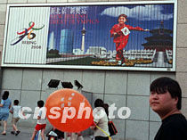 北京王府井新華書店新近掛起巨幅申奧宣傳牌,進一步表現出北京對成功申辦2008年奧運會的激情與信心。中新社圖 呂宗杰 攝