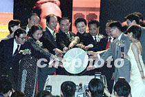 香港各界支持北京申奧暨世界三大男高音紫禁城廣場(chǎng)音樂(lè)會(huì)酒會(huì),五月二十一日在香港舉行。中央政府駐港聯(lián)絡(luò)辦副主任王鳳超、外交部駐港特派員吉佩定等出席。中新社傳真 任海霞 攝