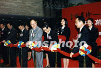 紀念西藏和平解放五十周年——《雪域珍藏——西藏文物精華展》二十六日在上海博物館開幕。上海市委書記黃菊(前右二)、市長徐匡迪(前右三)及西藏自治區(qū)主席列確(前右一)為展覽剪彩。中新社圖 姜煜 攝