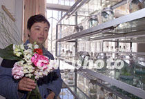 西藏自治區高原生物研究所的米瑪潘多日向人們展示她們培育出的高原鮮花,她和另外三位女性研究人員培育出很多適應高原環境的花卉,美化了西藏人的生活。中新社記者 滿會喬 攝