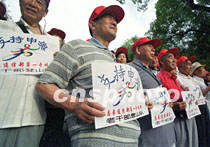 解放軍總參通信部退休老戰士二十八日佩帶“申奧”標志在北京西郊列隊,準備舉行蹬山活動,支持北京“申奧”成功。中新社記者 宋吉河 攝