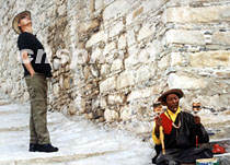 位于拉薩市郊的哲蚌寺迎來眾多的游客,一位外國游客和一位轉經的藏民各自沉浸在自己關注的世界中。中新社記者 滿會喬 攝