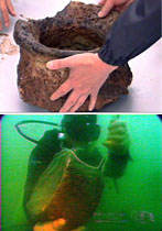 中國云南撫仙湖水下考古的隊員們六月三日九時許,在水下考古現場發現一個陶器,并將這個陶器運出水面進行研究分析,有專家認為這是漢代的“釜”(鍋),是一種生活用具。