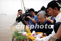 杰出的愛國宗教領袖、原全國政協副主席、民進中央名譽主席趙樸初因病于2000年5月21日在北京逝世。根據趙樸初的遺愿,他的骨灰于6月2日撒在上海吳淞口的大海。圖為趙樸初的夫人陳邦織捧起骨灰撒向大海。中新社圖 郭海鵬 攝