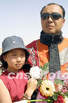 今年六月騎摩托車成功挑戰珠峰六千八百米極限的英雄楊華,十二日凱旋家鄉嘉峪關,在歡迎申奧車隊儀式上與愛女相擁而泣。中新社圖 魏孝明 攝