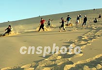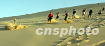 6月12日,“萬里行”鳳凰車隊在敦煌鳴沙山挑戰極限。圖為將士們登頂后從沙山上順坡而下,齊聲呼喊。中新社圖 魏孝明 攝