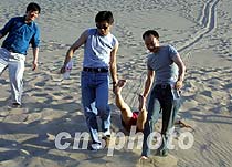 圖文:申奧“萬(wàn)里行”將士挑戰(zhàn)敦煌鳴沙山極限 2001年6月13日 09:38 ![]() “萬(wàn)里行”鳳凰車隊(duì)在敦煌鳴沙山挑戰(zhàn)極限。圖為將士們登頂后從沙山上順坡而下,齊聲呼喊。魏孝明 攝 ![]() 鳳凰衛(wèi)視編導(dǎo)李哲小姐雖發(fā)揚(yáng)“不怕苦不怕累”的精神,但終因體力不支,在沙坡上累倒了。圖為隊(duì)友把她從坡上“拖”下來(lái)的情景。魏孝明 攝