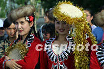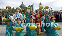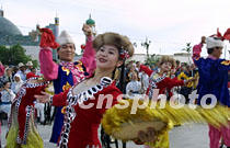 6月14日,“北京——莫斯科申奧萬里行”鳳凰車隊進疆抵達哈密市,當地民眾在哈密王陵前面舉行盛大儀式,歡迎遠道而來的客人。由哈密歌舞團表演的“哈密瓜”等民族歌舞奔放熱烈,表達了維吾爾族人民對北京申奧活動的深情厚誼。中新社圖 魏孝明 攝
