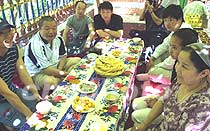 圖文:葡萄溝歡聲笑語“萬里行”一路順風 2001年06月17日 09:35 ![]() “北京——莫斯科申奧萬里行”鳳凰車隊自進入新疆以來,美麗神圣的天山一直陪伴著我們。圖為環抱新疆首府烏魯木齊的天山雪景。中新社圖 魏孝明 攝 ![]() 6月16日,“申奧萬里行”鳳凰車隊離開吐魯番前,“家訪”葡萄溝里的民族家庭。圖為遠征將士圍坐在家農葡萄院內的坑上美美地吃著哈密瓜。中新社圖 魏孝明 攝