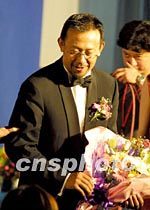 中國影星姜文十七日晚作為上海電影節閉幕式的特邀佳賓出現在眾人面前,圖為他準備為獲得最佳女演員的演員頒獎。中新社記者 潘索菲 攝