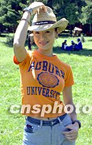香港小姐郭晶在烏魯木齊加入申奧萬里行活動,為北京申奧助威。中新社圖 魏孝明 攝