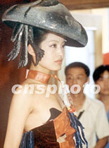 日前, 在北京舉辦一臺以漁家服飾為主題的現代創意時裝秀,參賽的服飾作品在款式上均于漁家生活貼近,并具有創新意識。圖為穿現代時裝,配戴一頂“魚型帽”的新穎作品。中新社記者 錢興強 攝