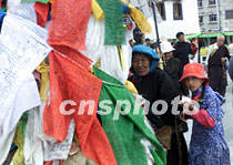 西藏拉薩每天圍繞大昭寺轉經朝圣的藏民絡繹不絕,一位藏族老奶奶帶著身穿漂亮衣服的孫女走在轉經的行列中。中新社記者 滿會喬 攝