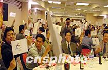法國60多個華僑華人社團22日晚聚會巴黎,聯名向國際奧委會和北京市申奧委發出公開信支持北京申辦2008年奧運會;并紀念世界奧林匹克日。圖為法國華僑華人會主席林加者等揭開由僑胞制作的“心愿杯”上的紅綢,期盼北京申奧成功.中新社記者 蔚中 攝