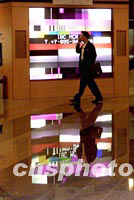 7月10日,莫斯科世貿中心酒店為國際奧委會112次會議的召開緊張籌備,設立在一層的巨幅電視屏幕將現場直播會議實況。中新社記者 王瑤 攝