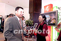 設立于莫斯科世貿中心酒店的五個奧運會申辦城市展臺,10日首次對傳媒開放。圖為北京展臺前參觀者向中國工作人員詢問北京申辦情況。中新社記者 王瑤 攝