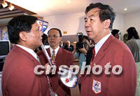 7月13日,國際奧委會112次會議在莫斯科世界貿易中心舉行,會議將表決2008年奧運會舉辦城市。圖為劉淇(左)與袁偉民在場外交談。中新社記者 王瑤 攝