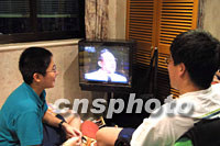 七月十三日晚上,許多上海市民足不出戶,在家里觀看中央電視臺轉播的北京申奧代表團陳述報告。中新社記者 潘索菲 攝
