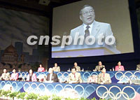 7月13日,國際奧委會112次會議在莫斯科世界貿(mào)易中心舉行會議,表決2008年奧運會舉辦城市。圖為中國國務院副總理李嵐清作申奧陳述。中新社記者 王瑤 攝