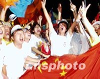 北京清華大學師生十三日晚歡呼北京申奧成功。中新社記者 張勤 攝
