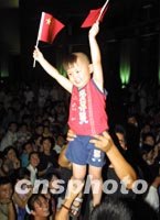 北京一名三歲半的兒童嘟嘟十三日晚和北京大學師生一起共慶北京申奧成功。中新社圖 李剛 攝