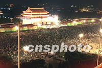 北京天安門廣場十三日夜人潮涌動,數以十萬計的民眾徹夜不眠慶祝北京申奧成功。中新社記者 毛建軍 攝