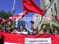 七月十三日,北京申奧成功,多倫多華人華僑在聯合火車站前街舉辦慶;顒。中新社記者 徐德金 攝