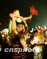 在山東省青島市歡慶北京申奧成功的游行隊伍中,一對父子情不自禁地揮舞著國旗,扭著秧歌,為北京喝彩。中新社記者 鄭萍萍 攝