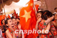 在莫斯科成功聲援北京申辦奧運(yùn)會(huì)的中央樂(lè)團(tuán)少女合唱團(tuán)小歌手們,圍著五星紅旗眼含淚花而歌唱。八年前,這個(gè)合唱團(tuán)也曾遠(yuǎn)征奧委會(huì)為北京申辦獻(xiàn)歌,失利后含淚返京。今日終于高唱?jiǎng)P歌。中新社記者 賈國(guó)榮 攝