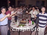 中國新聞社采編人員十四日一點在北京總社舉行夜餐慶北京成功申辦2008年奧運會。圖為副社長郭招金(左)、副社長劉北憲(右)與眾人舉杯相慶。中新社記者 鄒憲 攝