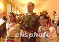 <align=left>北京西藏中學(xué)格桑花藝術(shù)團(tuán)的藏族姑娘,在莫斯科與祝賀北京申辦奧運(yùn)會(huì)成功而奏樂(lè)的俄羅斯軍樂(lè)團(tuán)軍官合影。中新社記者 賈國(guó)榮 攝