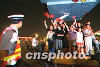 十四凌晨,北京市大批慶祝申奧成功的的年輕人站在長安街公安交通崗?fù)ど希煌ň煸谝慌暂p松觀望。中新社 劉殊瑾 攝